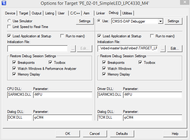 - 3. Choose the "CMSIS_DAP Debugger" from the drop down in the upper right hand side of the window. Specify the location of the LPC43xx_spifi.ini initialization file.