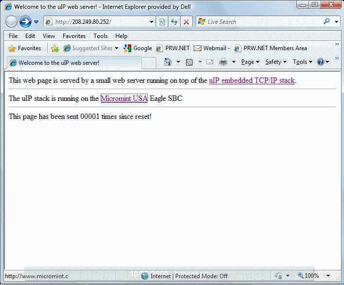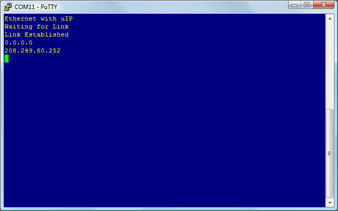This example application demonstrates the operation of the Stellaris Ethernet controller using the uIP TCP/IP Stack. DHCP is used to obtain an Ethernet address. A basic web site is served over the Ethernet port. The web site displays a few lines of text, and a counter that increments each time the page is sent.