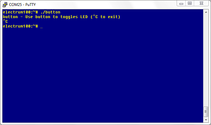 Electrum button ExampleFrom ManualsUses button to set LED (button)Compatibility Electrum 100This example uses the button connected to microcontroller pin PA31 to control the green user LED (ds2) at pin PA30. | ![]() |