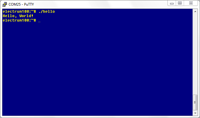 A very simple "hello world" example. It simply displays "Hello, World!" on standard output (stdout) and is a starting point for more complicated applications.