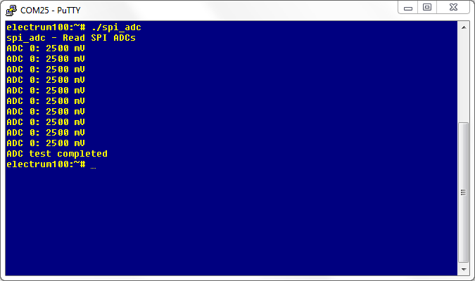 Electrum spi adc ExampleFrom ManualsTests SPI ADCs (spi_adc)Compatibility Electrum 100This example makes 10 readings of SPI ADC0 on header J7-1 and prints the results on standard output. Do not use voltages over 3.3V for this test. | ![]() |