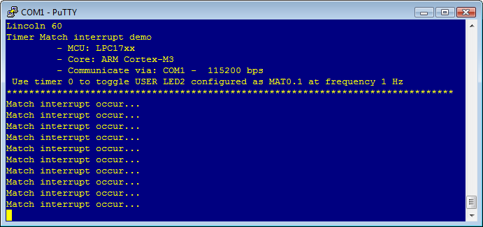 This example application demonstrates how to use a timer match in interrupt mode to generate specific time. In this case the specific time is 1 second. The first UART, which is connected to the COM1 on the Lincoln microcontroller board, is configured for 115,200 bits per second, and 8-n-1 mode. When the program is started a message will be printed to the terminal. The below screen shot is of the timer_match_int in action.