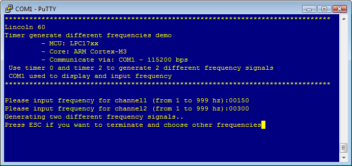 This example application demonstrates how to use Timer Match to generate 2 different frequency signals. Timer 0 and Timer 2 are usedto generate two different frequency outputs on MAT0.0 (J2 pin 19) and MAT2.0 (J2 pin 5). The first UART, which is connected to the COM1 on the Lincoln microcontroller board, is configured for 115,200 bits per second, and 8-n-1 mode. When the program is started a message will be printed to the terminal. The below screen shot is of the timer_gen_diff_freqs in action.