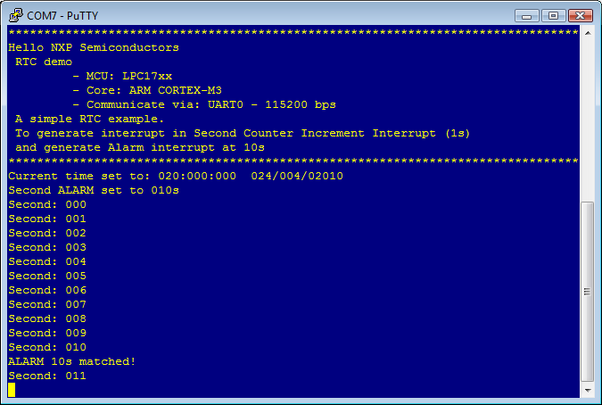 This example application demonstrates the use of the RTC to generate an interrupt when the seconds is equal to 10.